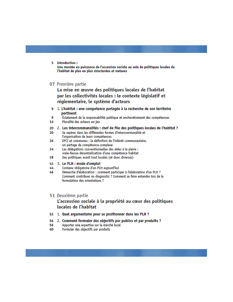 La première partie de ce guide a pour vocation de tracer le cadre législatif et réglementaire des politiques locales de l’habitat, ainsi que dessiner le système d’acteurs de ces politiques et leurs principaux outils.